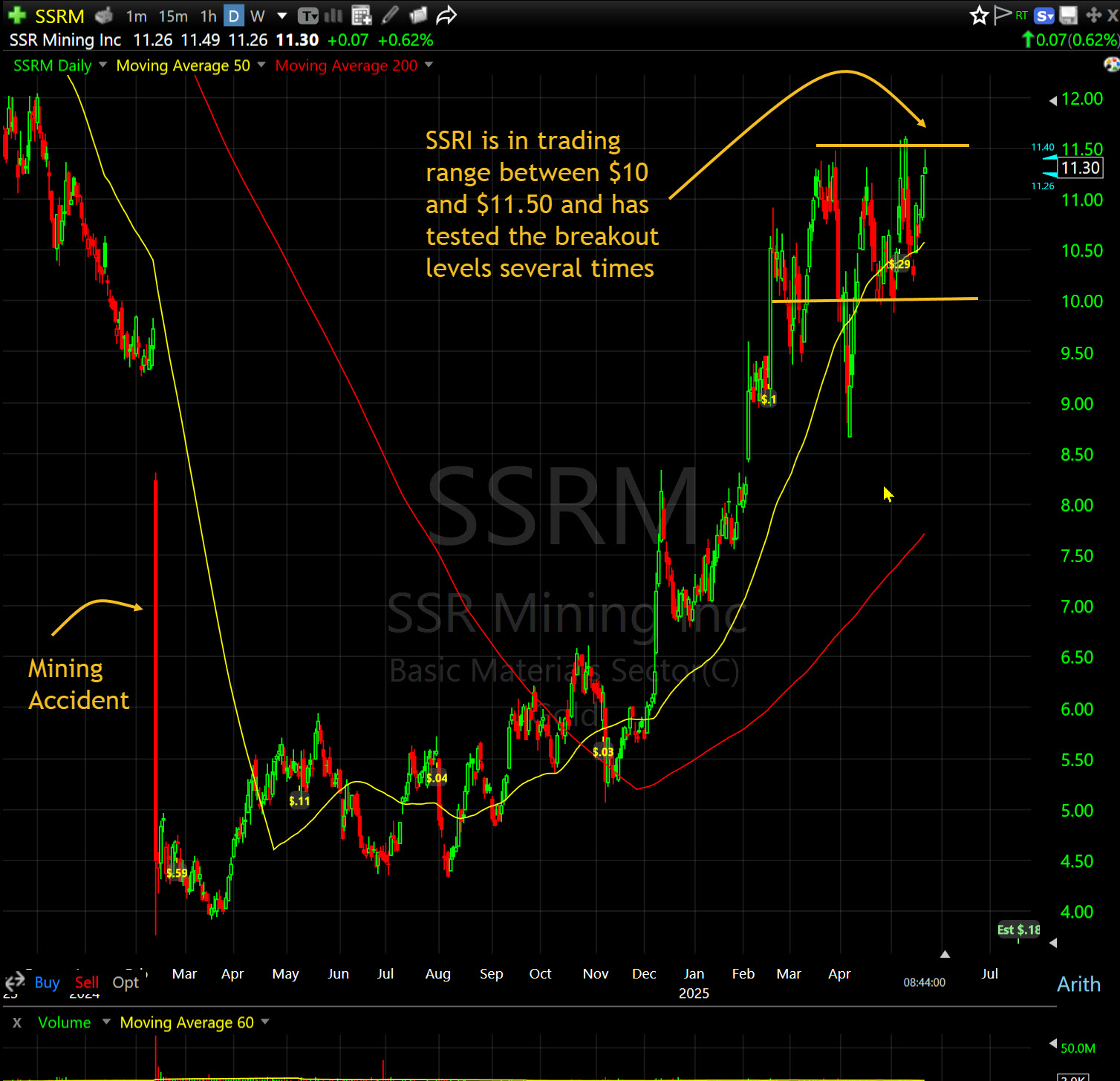 Technically, the stock has been in a trading range for about six weeks and is testing overhead resistance. Better action in gold will likely trigger a breakout. I’ve taken an initial position and will be trading it as it develops.