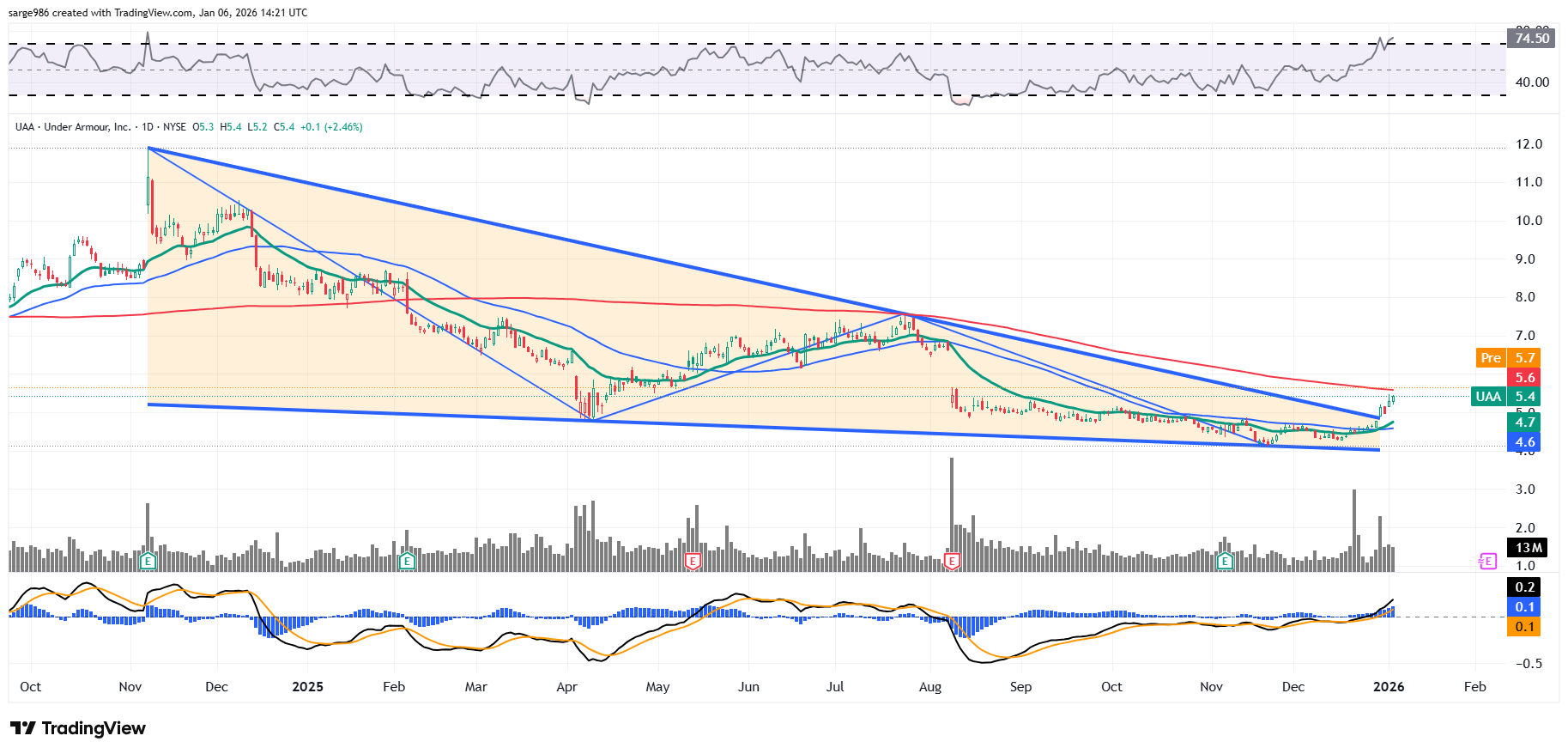 Relative Strength is juiced to the point of possibly being overbought. The daily moving average convergence divergence is currently about as bullish as a daily MACD can be with all three components where they need to be to spring a rally. I am not as aggressive as our friend, Jay Sole, but I actually have skin in the game. My target for the trade is an even $7 (for the UAA, that's when I'll sell the UA. Unless I figure out a profitable ratio for a pairs trade to get me out of one and into the other).
