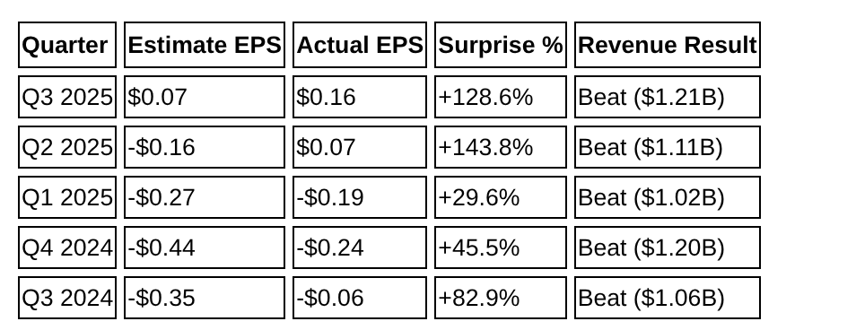 A sympathy selloff in ROKU alone may be justification for a ROKU trade, but I am also looking at its upcoming earnings report. ROKU has been a notorious low-baller. It has consistently beat analyst estimates by a substantial margin. Here are ROKU results vs. estimates for the last five quarters: