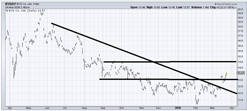 Boyd (BYDDY) is forming a base. Earnings are out later this week, so be careful. However, this is a base in the making and a pullback into that 12-12.50 area would be a positive and buyable.