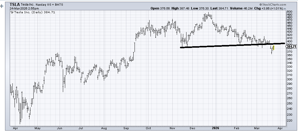 I want to hate the Tesla (TSLA) chart, but TSLA is like the bad guy in the monster movies who just keeps rising from the dead. If it can get back over 400, then this will look like a false breakdown.