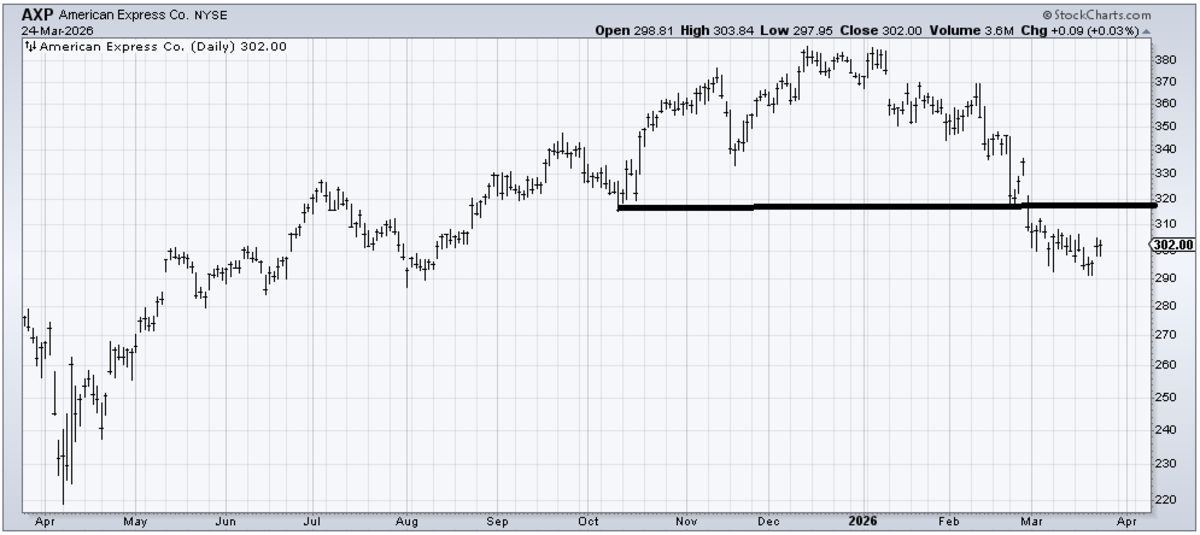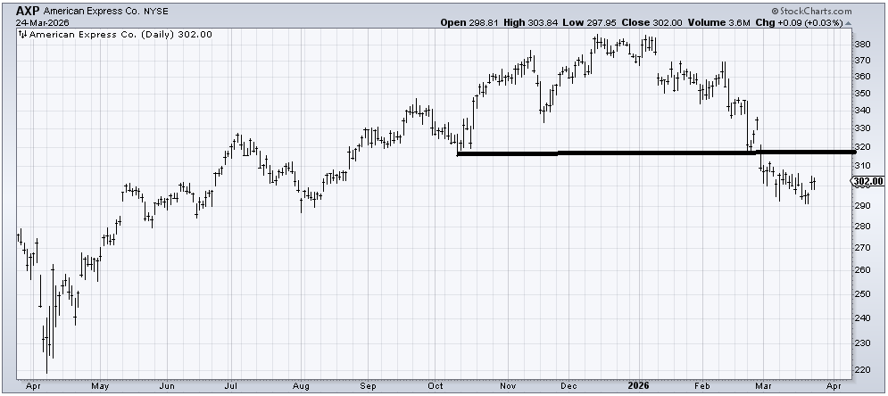 Last Thursday, I said I thought American Express (AXP) could rally, and it has had exactly one up day since! But I still think it has a chance at a trade toward that 310-315 area.