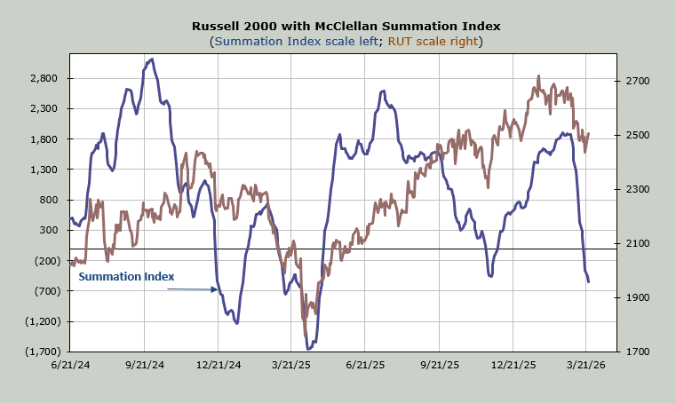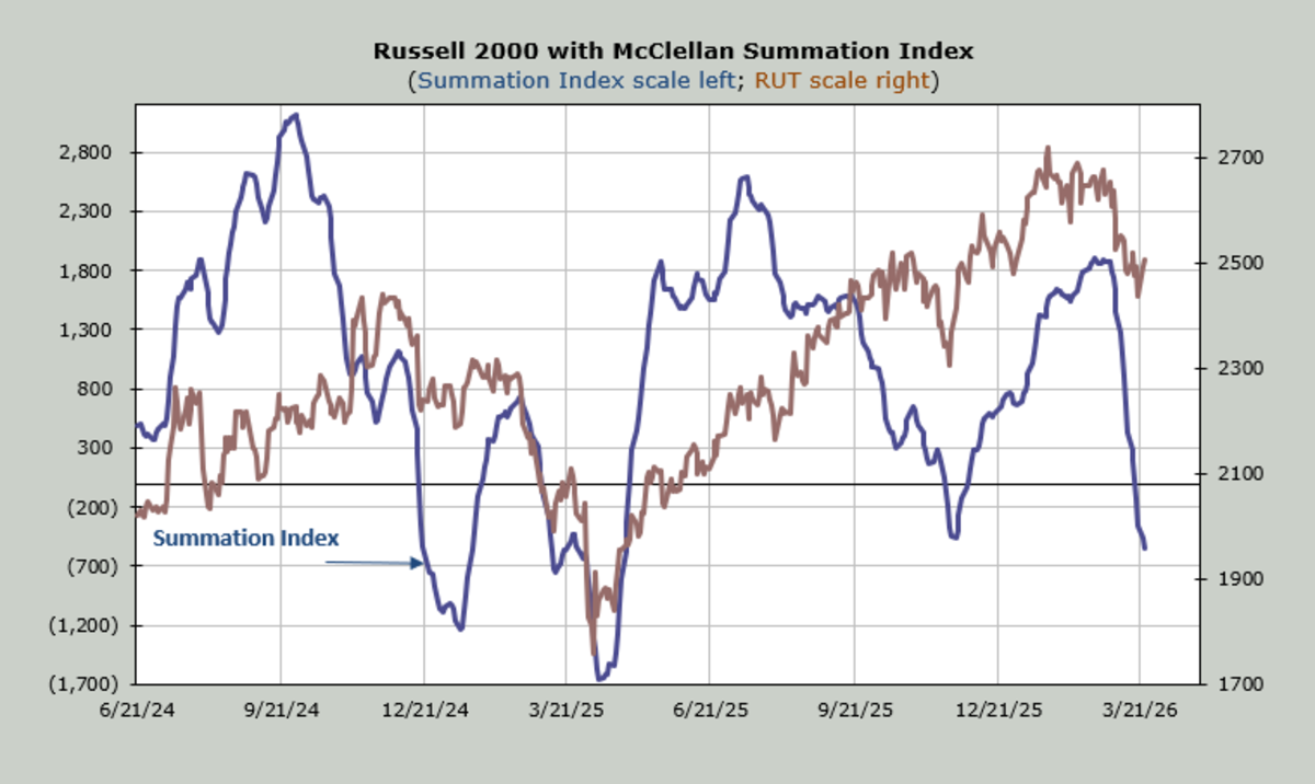 The McClellan Summation Index is still heading down. It needs a net differential of +1600 advancers minus decliners on the NYSE to halt the decline.