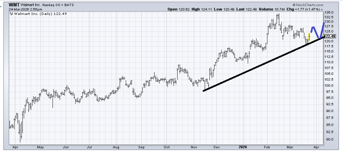 At 132, I thought Walmart (WMT) had gone far enough. It has since sold off to light support. It’s not my type of chart, but if you want to buy it, then use a stop under that 117 area. Maybe if it maps out as I drew in blue, I would like it again.