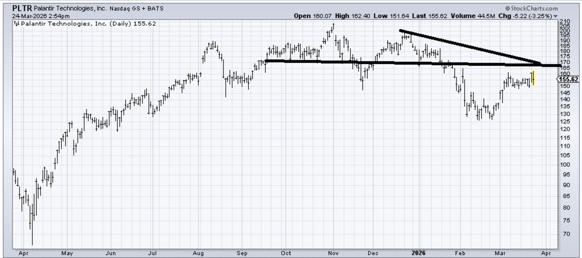 Palantir (PLTR) has a lot of resistance in the 160-170 area, and that little bottom it formed in February measured to 165. You do not want to see it slip back under 148.