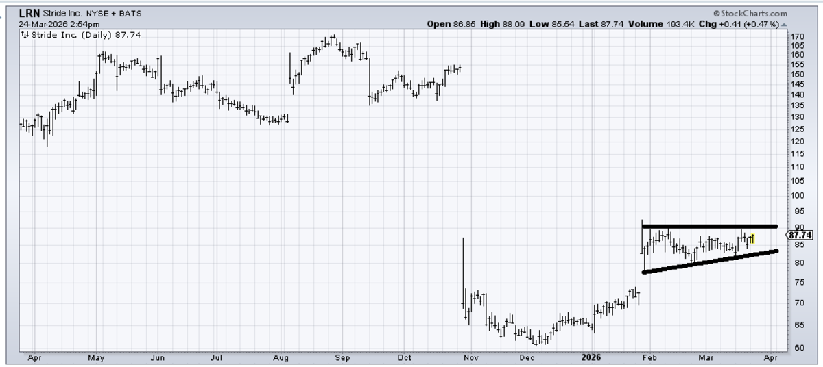 Stride (LRN) is my kind of chart because it gapped up and then consolidated the gap. However, unless it can get through 90 like it means it, I don’t want to anticipate the breakout because many of the stocks that held up (ex energy) in the recent decline have not rallied well when given the chance. Perhaps that will change.