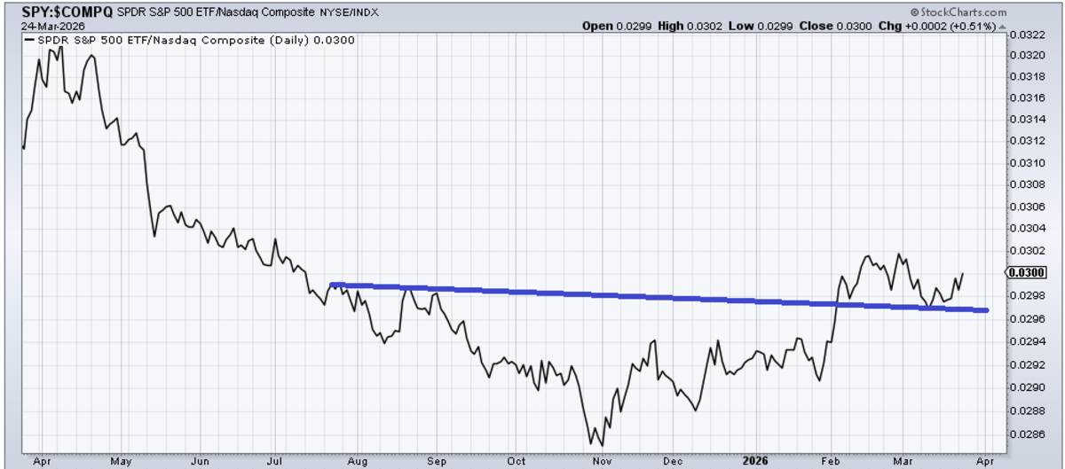 But we can see it because the S&P has been red for four of the last five days, and Nasdaq has been red for six of the last nine days. That’s why we see the ratio of the S&P to Nasdaq rising again. If it can’t get over those late February highs, I would take that as a sign that the Mag 7 are back in vogue. Alternately if it breaks under that blue line, that would be a sign that this play is over.