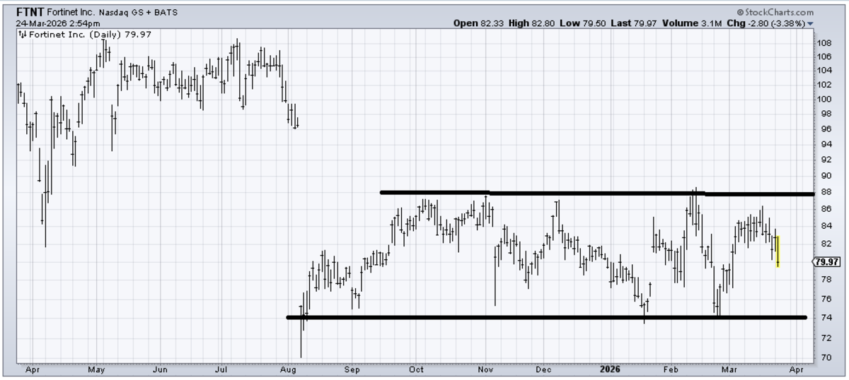 Fortinet (FTNT) is in what we call a rectangle, meaning that for approximately 3-4 months, the stock is in a very well-defined trading range. That means somewhere in the mid to upper 70s, you want to buy it with a stop under 74.