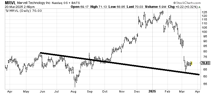 Marvel MRVL has decent support in this 60-70 area, but that gap down is not decent. Just look at that sideways action from April through September that gave way to the rise into January. So, while the stock is oversold down here now and ought to rally, it probably needs a lot of time to rebuild a base.