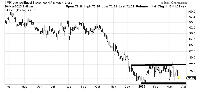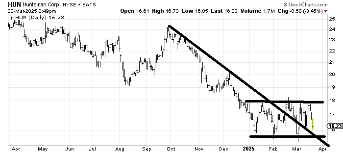 Huntsman HUN has gotten no traction at all in the year 2025. If it breaks that low around 15.50, then it’s a fresh leg down measuring near 12-ish.