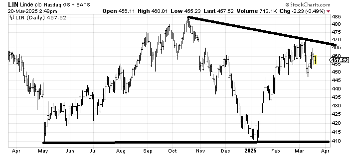 I would like to be bullish on Linde LIN, but the stock feels more like it is in the middle of nowhere than trying to find buyers. It does tend to trade rather thinly, so I would take levels with a grain of salt. However, it would be best if it did not break that low around 446.