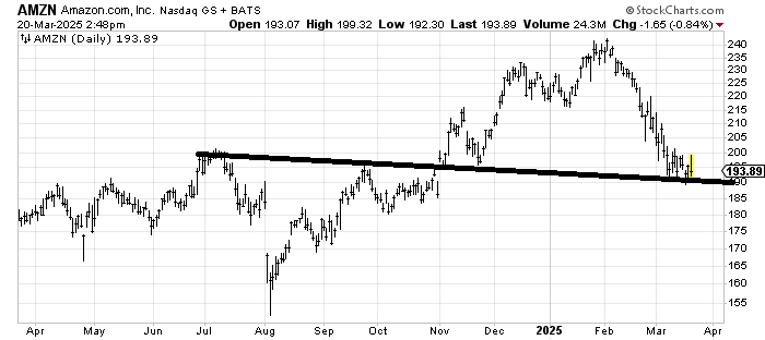 I have been inclined to be a buyer of Amazon AMZN for a few weeks now since it has good support down here, but I will say that if it cannot get up and over 200 in a hurry, the likelihood it breaks 190-ish goes up. Since there is so much support all the way down, it’s hard to say where it would go, but holding here is important for it.