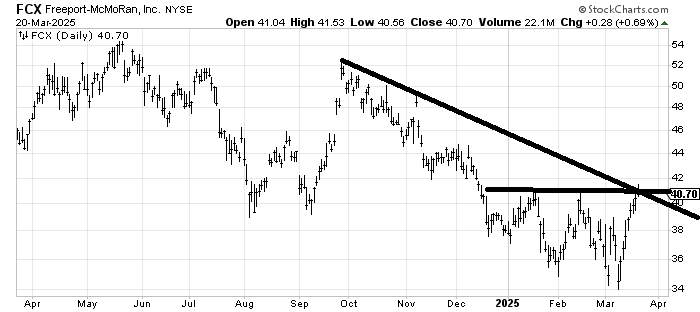 Someone has asked about Freeport McMoRan FCX several times of late, so I wanted to follow up. It is now at resistance and overbought. It is also up 18% since we got oversold. My guess is it’s due for a pullback now. Pulling back toward 38-ish and holding would be good. Much more than that, and we’d have to take another look.