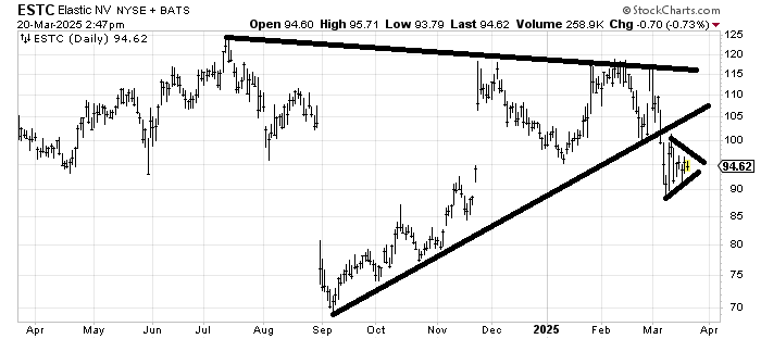 Elastic NV ESTC has broken the uptrend line and yet it has also filled the gap from November. I am inclined to think this is a flag, so if it breaks 90, I would get out. If it can recapture 100, it has a chance at improving.