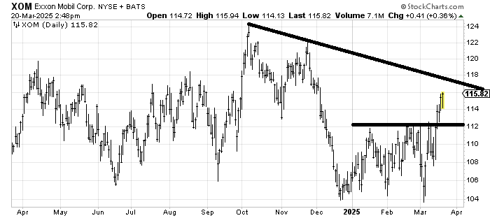 I have been positively inclined toward the XLE stocks for a while, but I still think Exxon XOM runs into trouble at that downtrend line. Those spikes in the low 120s are a problem as well. My guess is this run stops around 118-120, and then we can see what’s what.