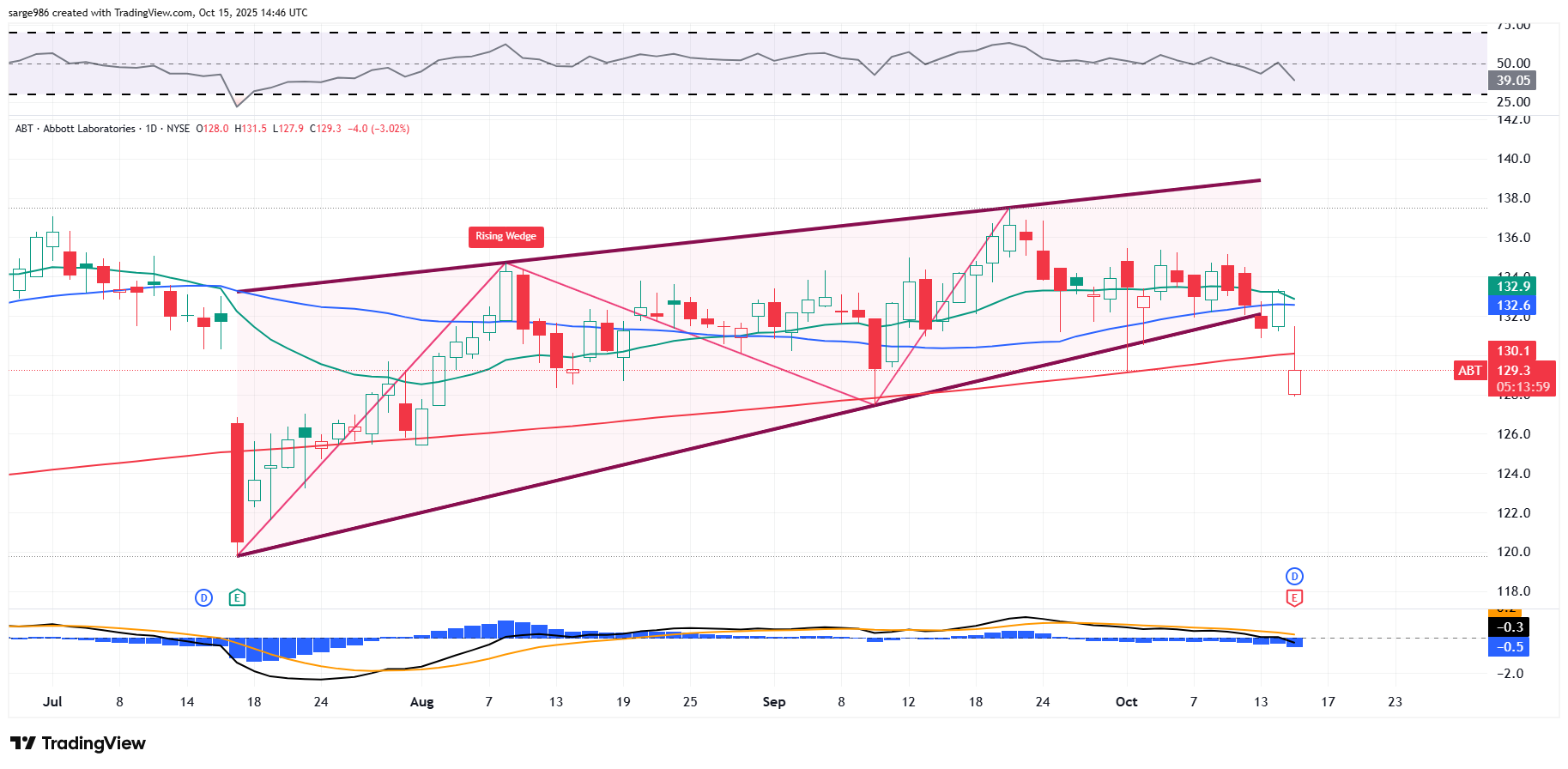Last time, ABT lost the lower trendline of a rising wedge pattern (June), the stock gave up 11%. Losing the 21-day line means losing the swing crowd. Losing the 50-day line means losing some of the pros. Losing the 200-day line means losing a lot of the pros and the ones that hang around will be pressured by their risk managers to reduce exposure.
