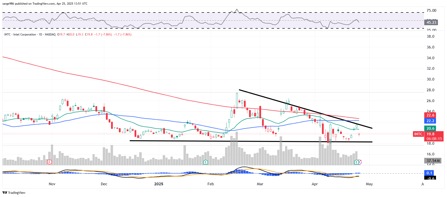 Intel is developing what looks like a descending triangle. Remember the ascending triangle in Friday morning's Market Recon? I told you that was a bullish setup. Well, as readers have already likely deduced... descending triangles are bearish technical setups.