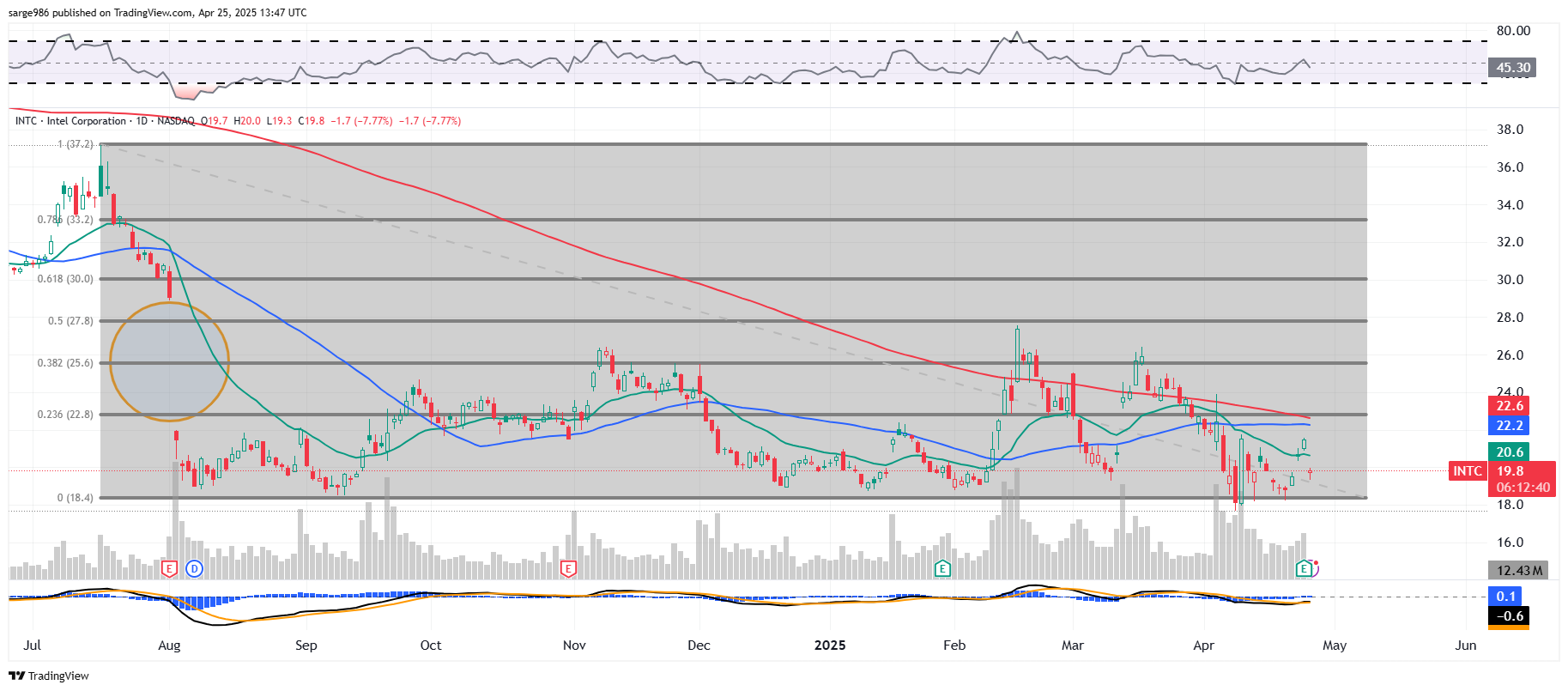Readers will see that INTC has tested support in the same general area many times since last summer. I may enter at or close to that $18-ish support level, but I wouldn't risk much there as there is some danger, which I will show you in a second. I would rather grab some of these shares on momentum should the stock ever take back its 50-day SMA, 200-day SMA and 23.6% Fibonacci retracement level of the July through April sell-off. Why don't I really want to initiate at that support level?