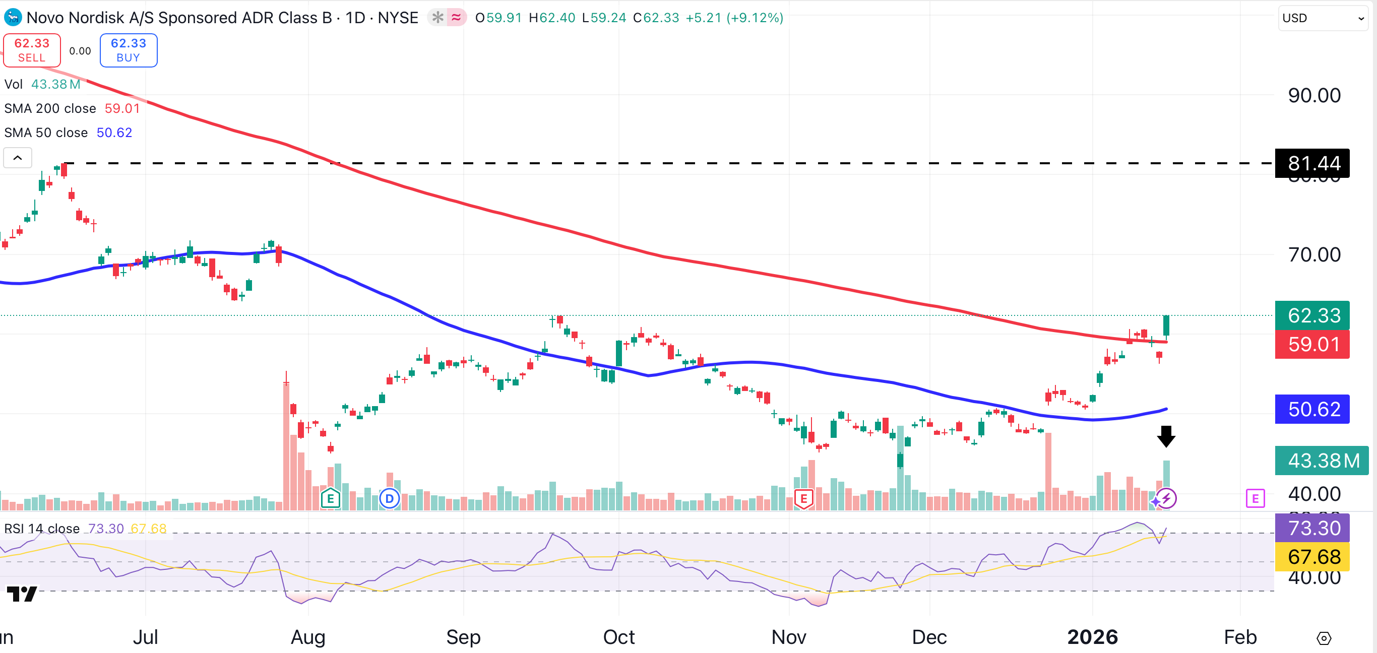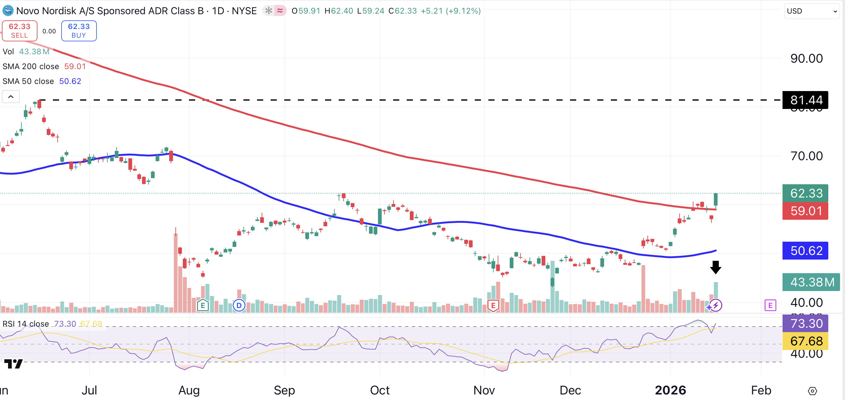 Yet that’s exactly what happened to Danish pharmaceutical company Novo Nordisk (NVO) . The company’s NYSE-traded ADRs jumped 9.12% on heavy volume (arrow) on Friday.