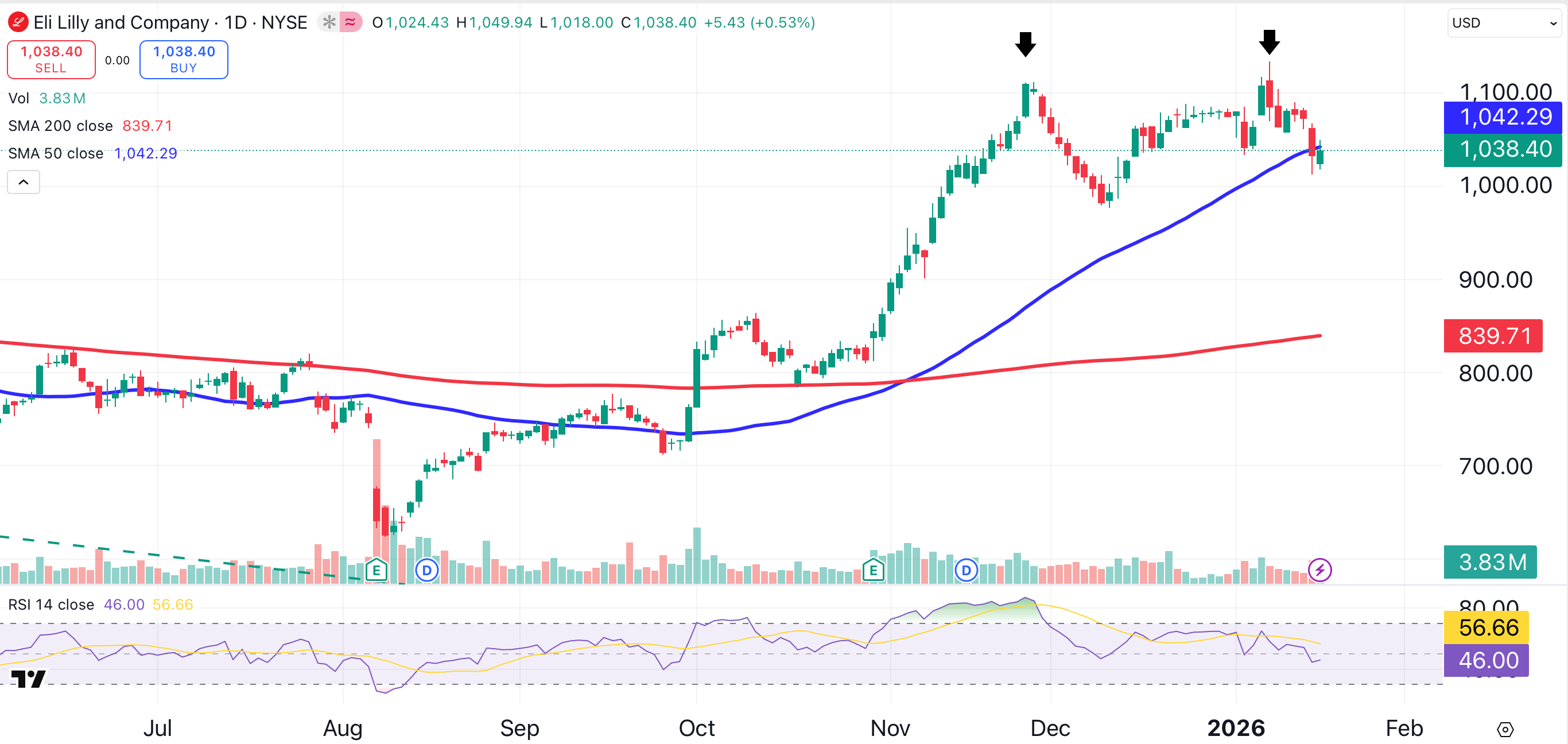Despite this home-field advantage, Lilly’s chart shows a stock falling below its 50-day moving average (blue). Lilly also appears to have formed a bearish double top (arrows)