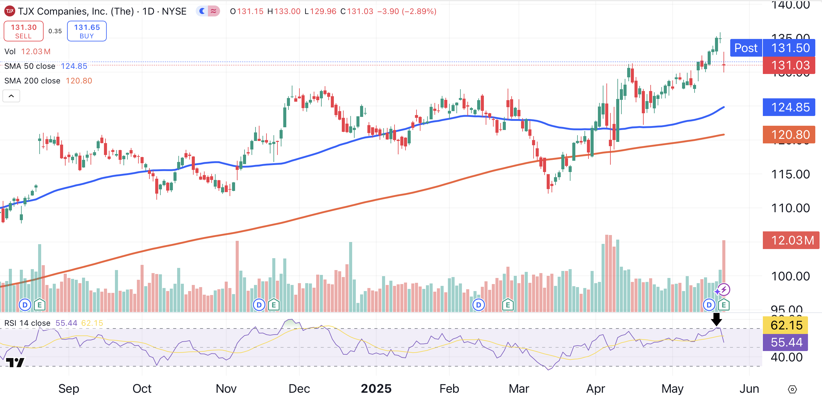 Before Wednesday’s pullback, TJX was overbought according to its RSI (relative strength index) indicator (black arrow). Now that the stock is trading off its highs, this is no longer the case.