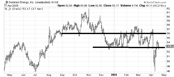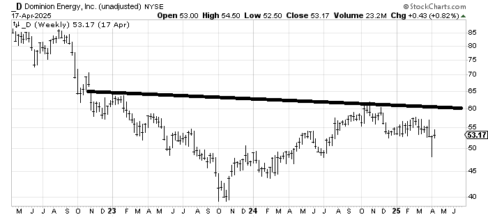 I’m going back to the high dividend-paying names. Today, we’ll look at Dominion Energy D. On the daily chart, it’s not great as that resistance overhead goes all the way up. Yet my affinity for spike lows is still with me, so I would be interested on any trip back down. But patience will be required.