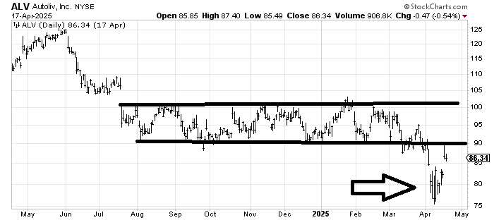 Autoliv ALV has so much resistance overhead starting at 90; it’s hard to get too excited over the chart. But that island down below (arrow) has me intrigued. If it fills that gap from last week (83-ish) then the resistance overhead matters a lot (i.e. it will take a long time to eat through it) if that gap does not get filled and the stock gets over 90 it will still take a while but less so because islands tend to be washouts.