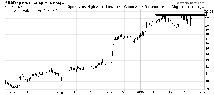 Sportradar SRAD is definitely a stock in an uptrend. As someone who struggles to chase it’s hard for me to jump on board a stock on the new high list in this market. There is a measured target in the 26-ish area. If the stock heads back under 22, I’d get concerned.