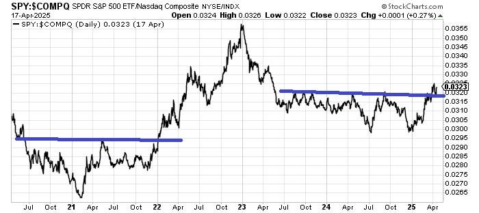 Finally, there is one other ratio chart we should look at. The ratio of SPY to Nasdaq. My view has typically been that when the S&P does better than the Nasdaq, it’s because there is a ‘flight to safety’.