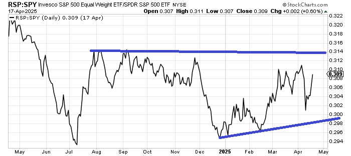 If we look at it a different way, the equal-weight S&P (RSP) has been outperforming the S&P since the calendar turned to 2025. I know it doesn’t feel that way, but the low in this ratio was made in the final days of December.