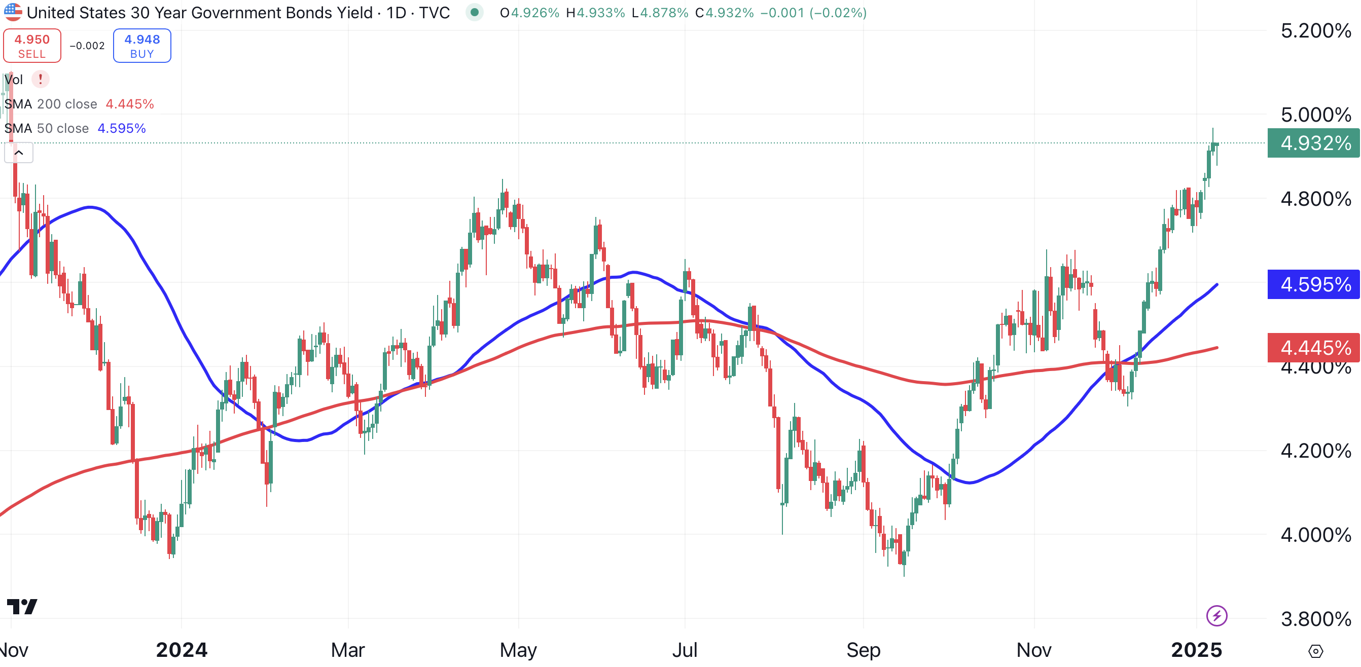Why are shares of Verizon falling? The most likely culprit is the recent relentless rise in bond yields. The yield on the 30-year U.S. Treasury bond is currently just below 5%, a rise of over 100-basis points since September. The 30-year T-bond now boasts its highest yield in over a year.