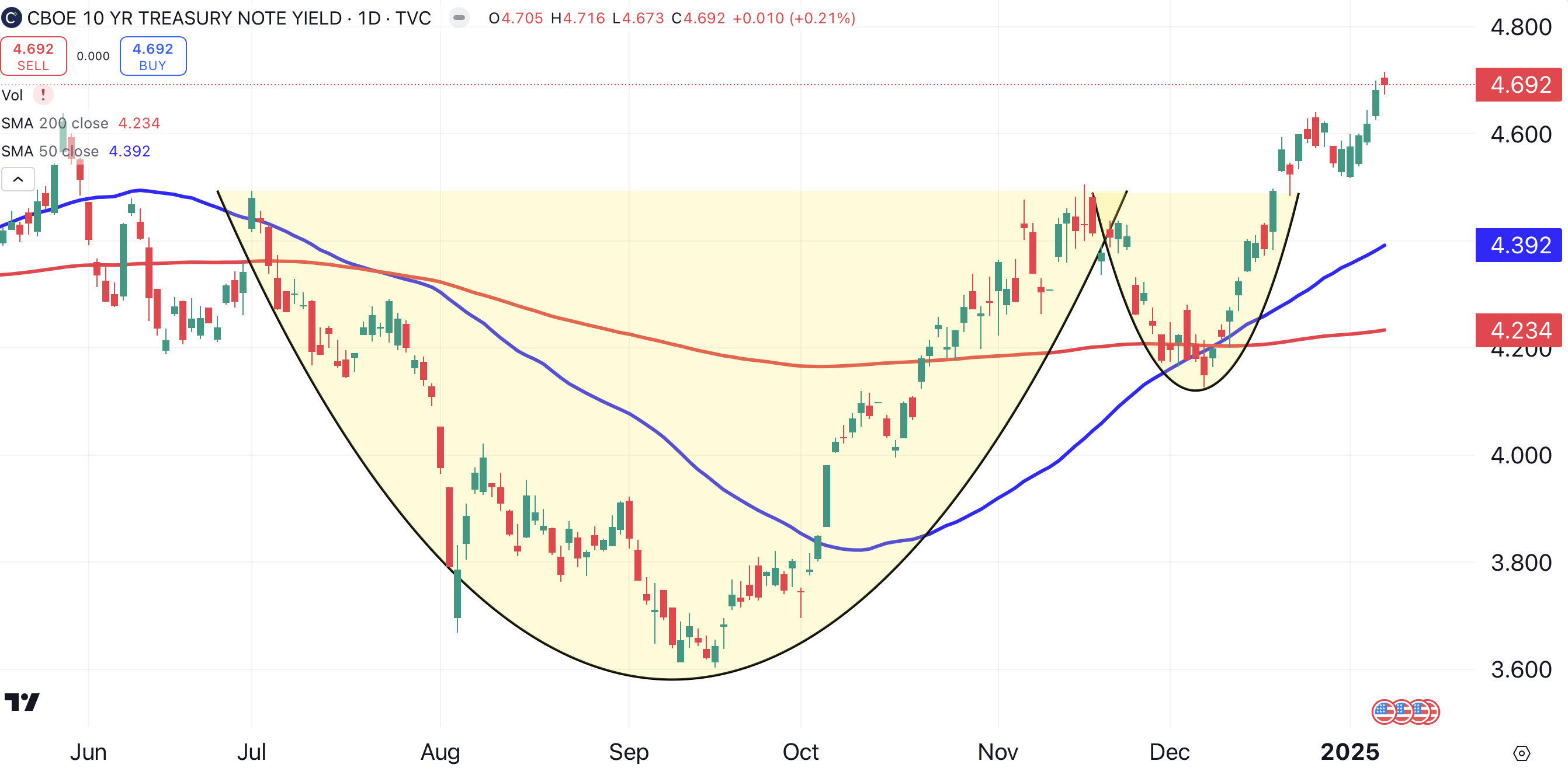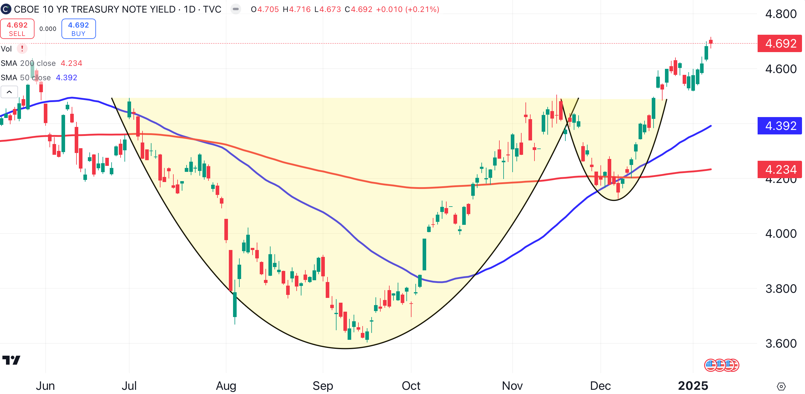 The risk of buying Verizon is that Treasury yields might continue to rise. If the yield on the 10-year U.S. Treasury note keeps climbing from its current 4.7%, investors will need higher yields on stocks like Verizon to justify their inherent risk. The 10-year T-note’s yield recently broke out of a bullish cup and handle pattern (shaded yellow), a sign that it could be headed higher.