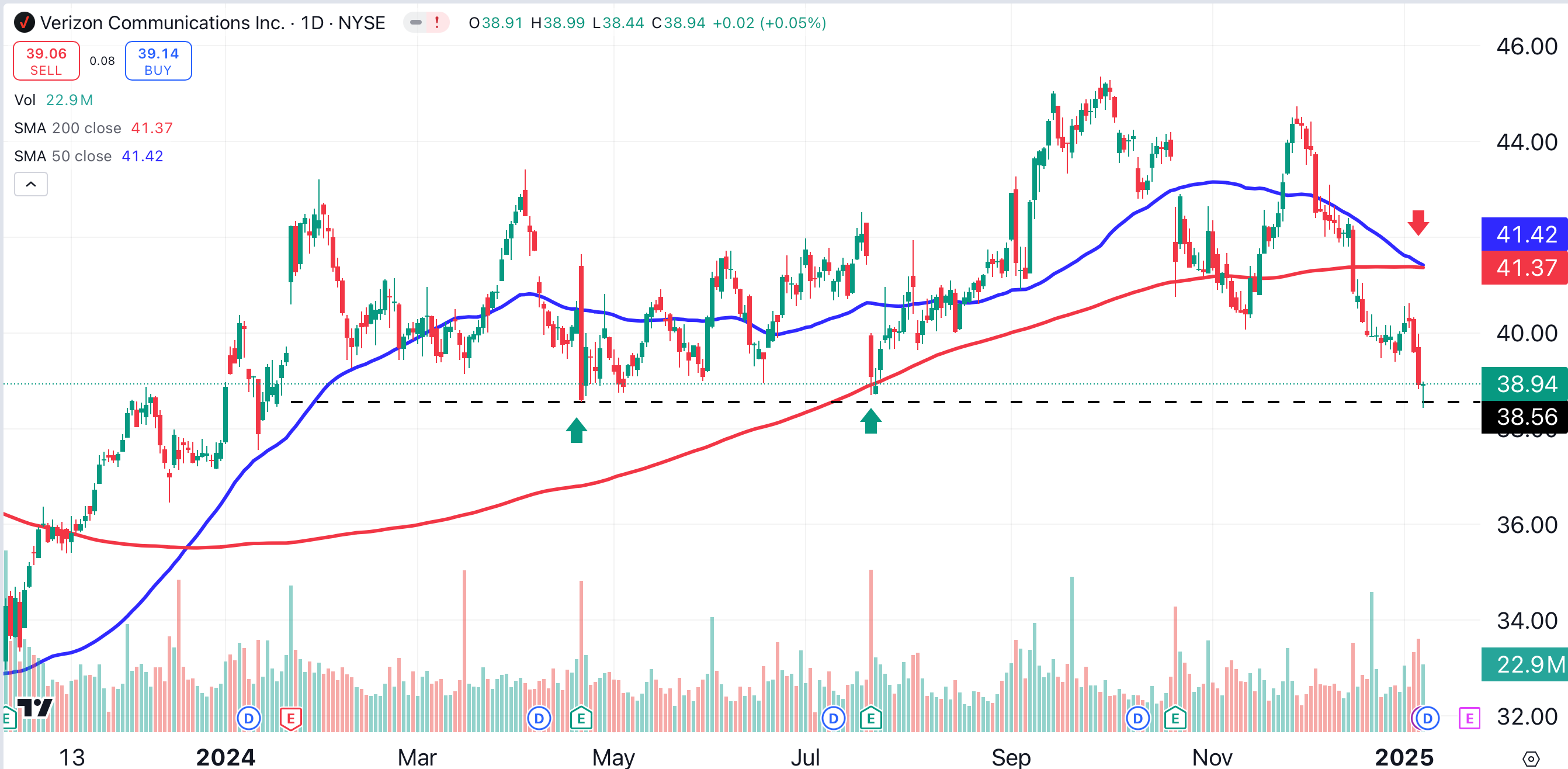 The stock, however, has declined to a strong support level (black dotted line) near $38.50. Verizon tested this level on several occasions last year (green arrows). The first bounce, in April, led to a rally of about 10%. A subsequent bounce in July led to a 17% rally.