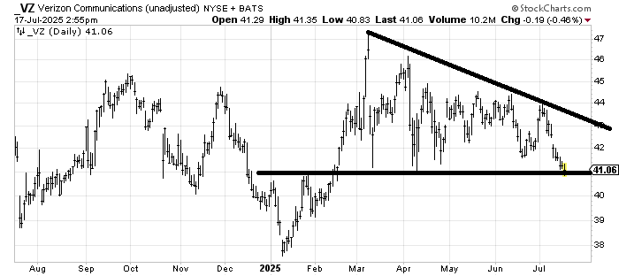 Verizon VZ has some decent support in this $41 area so it really ought to try and hold here. But like so many stocks, it has languished.