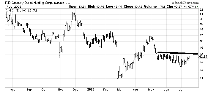 Sometime a few months ago I was asked about Grocery Outlet GO. I didn’t love the chart but promised to keep an eye on it. Well, it is finally shaping up and if it gets through $14 it might catch a few eyes.