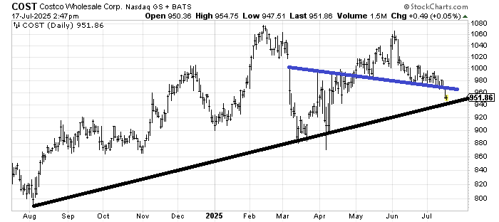 I thought Costco COST would hold that blue line and clearly it hasn’t. It really should hold this $940 area (black line). Should it rally and be unable to get back over the blue line I would get quite concerned about the chart.