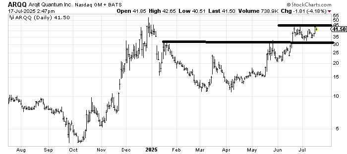 Arquit Quantum ARQQ has good support at $30 but it ought to get over $45 and take a stab at that December high just over $50. That base measures to that $50-ish area.
