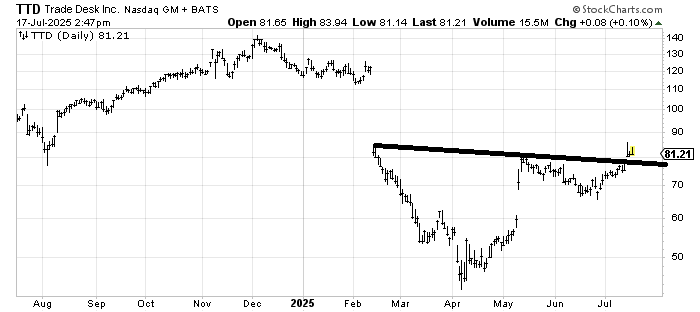 The Trade Desk TTD got over that resistance line on news it would be included in the S&P and has had no follow through since. As long as it stays over $80-ish it gets the benefit of the doubt. Can it fill that gap? It would be best if it could do it before the inclusion into the S&P because often that makes a short-term top. But for now, back under that line and it’s not good; over it, it’s good.