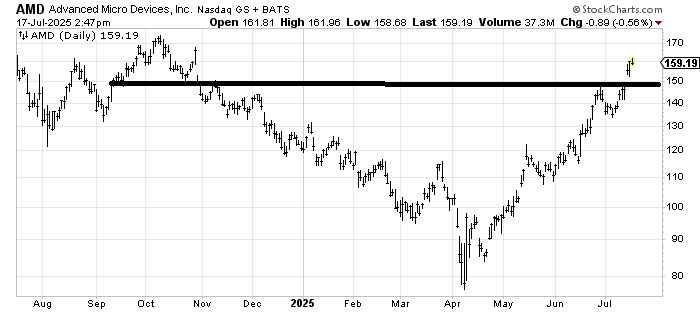 I really thought Advanced Micro Devices AMD would come down and test that $120-ish area before heading up again but instead it zipped right up to fill that gap at $160. I cannot chase it up here since it is just not my style to do so but as long as it stays over $150 it’s okay to hold. There is a measured target right here around $160.