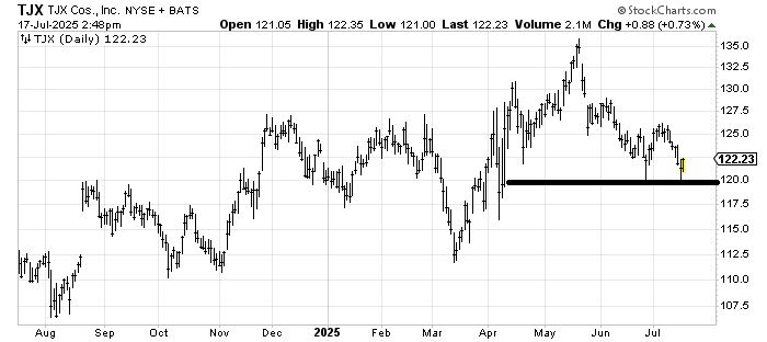 TJX Cos. TJX is trying to hold $120, so as long as it doesn’t break that level then it’s okay, but there is an awful lot of resistance all the way up.
