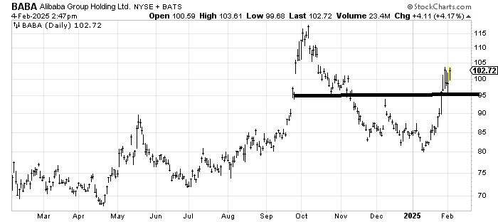 Alibaba BABAF has resistance all the way up but that base it broke out of measures to the 110 area as a next target. I would use a stop under 95 and move it up to 100 if the stock gets over 105 readily.