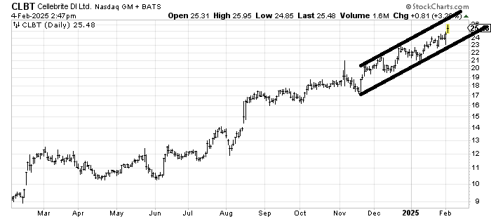 There is not much to say about Cellebrite CLBT except it is a stock in an uptrend and within that uptrend it is in a well defined channel since November. If you are trading it you buy the lower line and sell the upper one. If you are an investor you hold on unless it breaks that lower line.