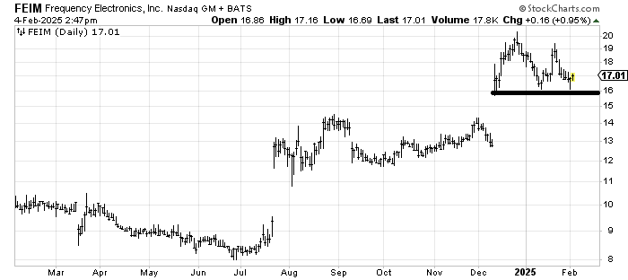 Frequency Electronics FEIM used to have a different ticker symbol (!!). As long as it holds over 16 it looks to me like the stock is a buy with a stop under there. Next resistance is 19-20.
