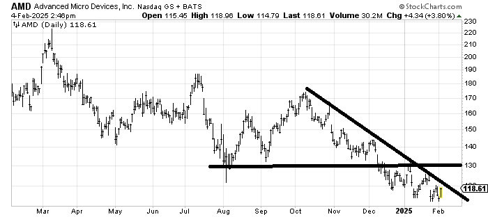 I tried to bottom fish Advanced Micro Devices AMD a few times last year and got burned almost every single time. Is there anything different now? The only thing that is different—or could be—is if it can cross that downtrend line. That doesn’t take it out of the woods but it changes the pattern that has been in place for our months now: lower lows and lower highs. I still think there is a lot of resistance at 130 but crossing that line makes a difference.