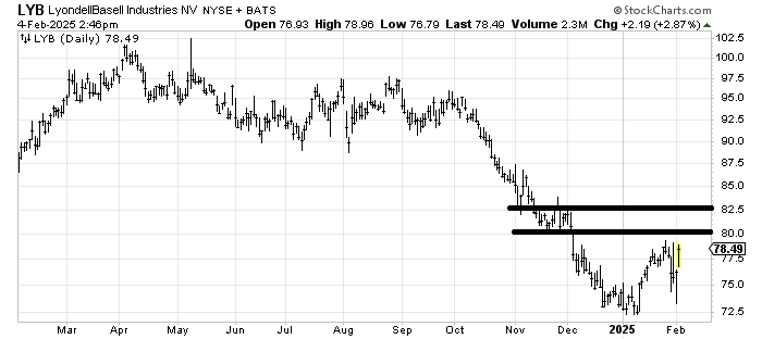 I would guess Lyondell Basell LYB can rally to 80-82 before it runs into enough resistance to stop it.