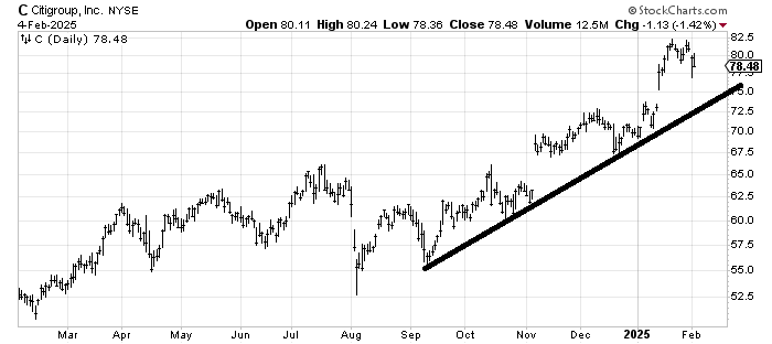 I was asked to look at Citigroup last week and I thought it needed a pullback. But the action over the last two weeks has me concerned it needs more than just a pullback. It might just need to come down and tag that line which is almost ten percent lower from here. It would also fill the earnings gap.