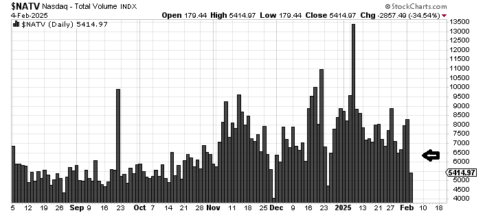 Finally, regarding Nasdaq volume. Early in the year, I talked about all the speculation and volume which you can see on the chart of Nasdaq volume. I think this hasn’t been fully updated yet for Tuesday’s trading, but Tuesday’s volume was where I have placed the arrow. Notice that the overall volume has been trending lower in the last week or so. I would like to see it more normalized (roughly 5 billion shares a day) but that usually comes after a steeper correction than we’ve seen.