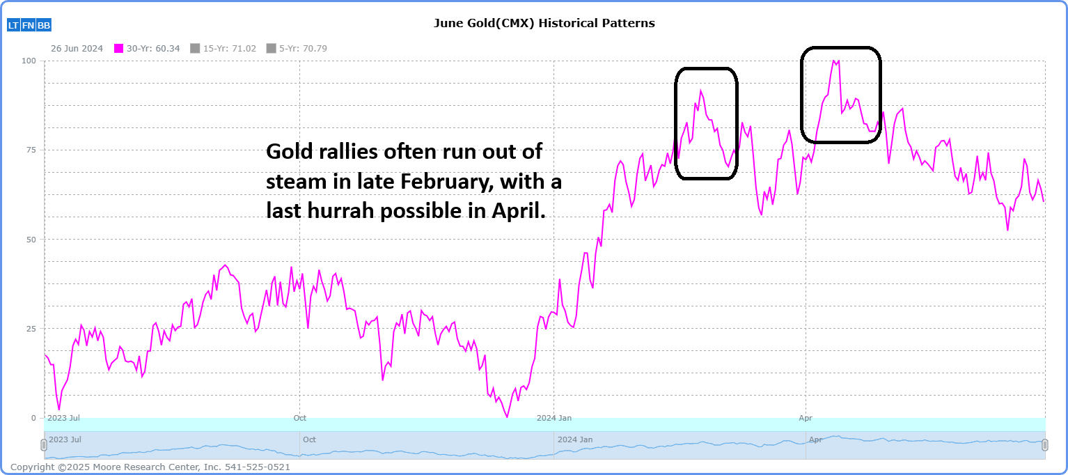 Seasonality in gold turns bearish this week, and the gold bugs seem to be getting a bit over their skis. According to the COT Report, most buying power is likely employed, and the sentiment is quite lopsided.