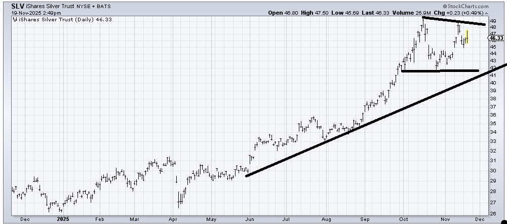 (SLV) , an ETF to be long Silver, looks fairly similar to me as it did a week ago: trapped in a wide range. Now, a week ago, the DSI was over 80 as it approached that old resistance area. After last week’s back-off, the DSI is 59, so at least that has turned neutral. Generally speaking, I just prefer when the chart has done more work and is less spikey. I’d love to see a quick test down to $44 that holds.
