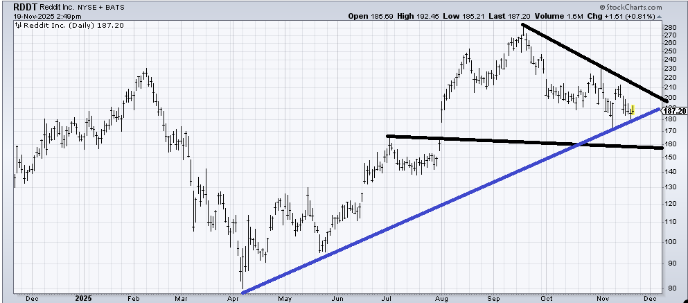Reddit (RDDT) would have been better off filling that gap at $160 two weeks ago rather than falling short in doing so. Now I don’t trust it to rally well. A break of $180 I believe, sends this down toward $160.